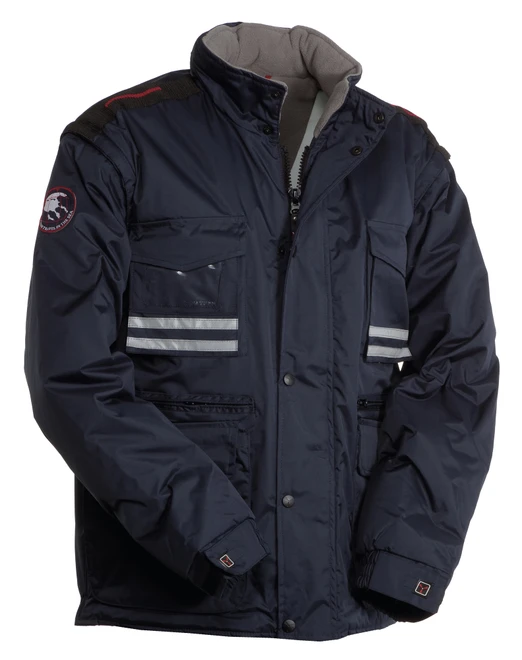 8 mm široký plastový zip po celé délce, kovový jezdec, klopa s cvoky po celé délce, odepínací rukávy, odepínací kapuce, nastavitelné manžety, reflexní proužky vpředu i vzadu, boční ventilační otvory na zip, 9 vnějších kapes - 2 se speciálním zavíracím systémem, 2 na zip a s vyztuženým vnitřkem, 1 kapsa průhledná, vatová vycpávka, podšívka na límci z microfleecu