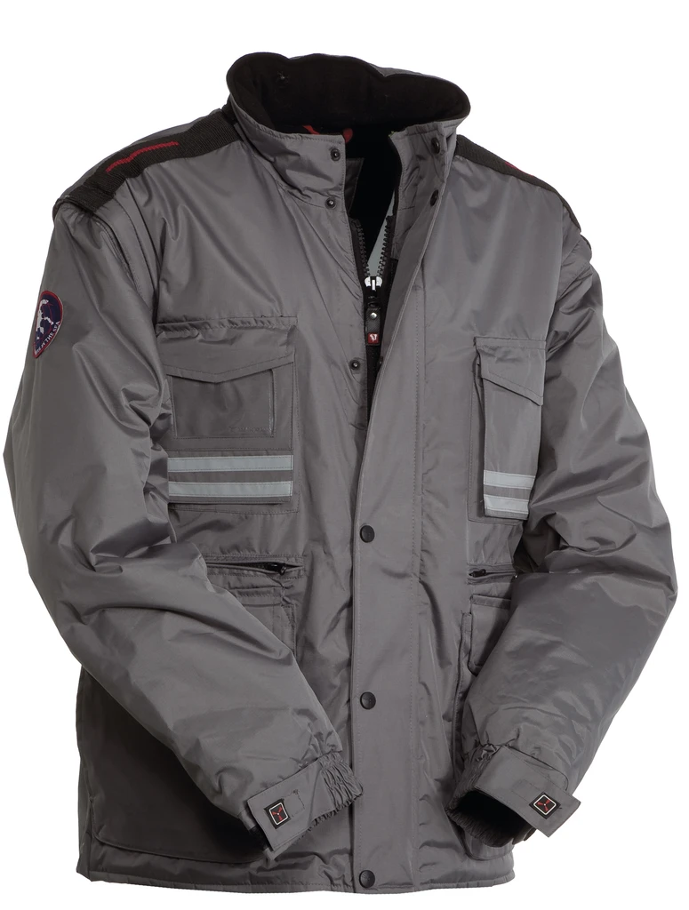 8 mm široký plastový zip po celé délce, kovový jezdec, klopa s cvoky po celé délce, odepínací rukávy, odepínací kapuce, nastavitelné manžety, reflexní proužky vpředu i vzadu, boční ventilační otvory na zip, 9 vnějších kapes - 2 se speciálním zavíracím systémem, 2 na zip a s vyztuženým vnitřkem, 1 kapsa průhledná, vatová vycpávka, podšívka na límci z microfleecu
