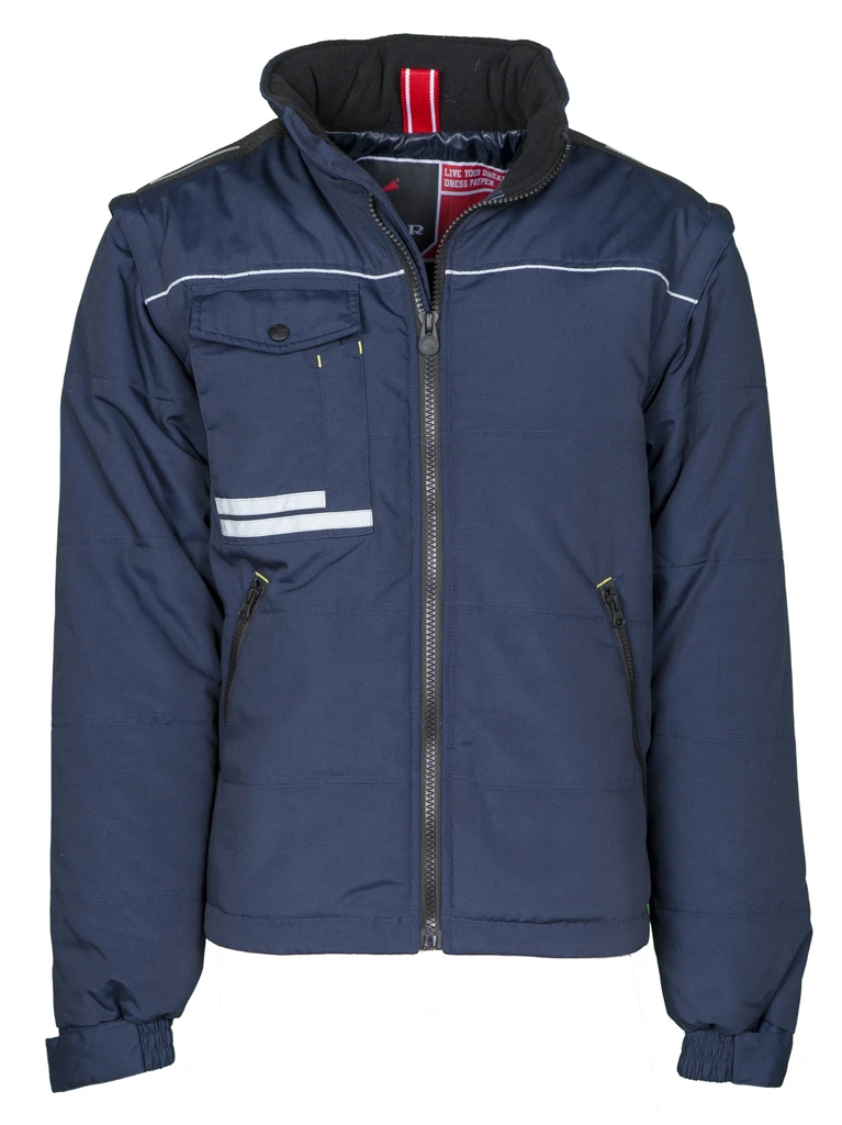 Odepínací rukávy, černý 8 mm široký plastový zip po celé délce, kovový jezdec, 2 prostorné vnější kapsy na zip, prostorná multifunkční kapsa na hrudi na mobilní telefon, vnitřní kapsa, reflexní proužky na hrudi, vatová vycpávka, fleecová podšívka na límci