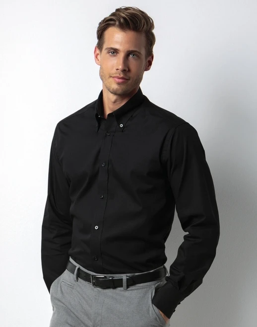 Stojací límec s knoflíčky, jednotně prošité průramky, dvojité prošití rukávů a bočních švů, sedlo na zádech, zaoblený lem, 2 náhradní knoflíky, pletený štítek Kustom Kit, snadné žehlení.