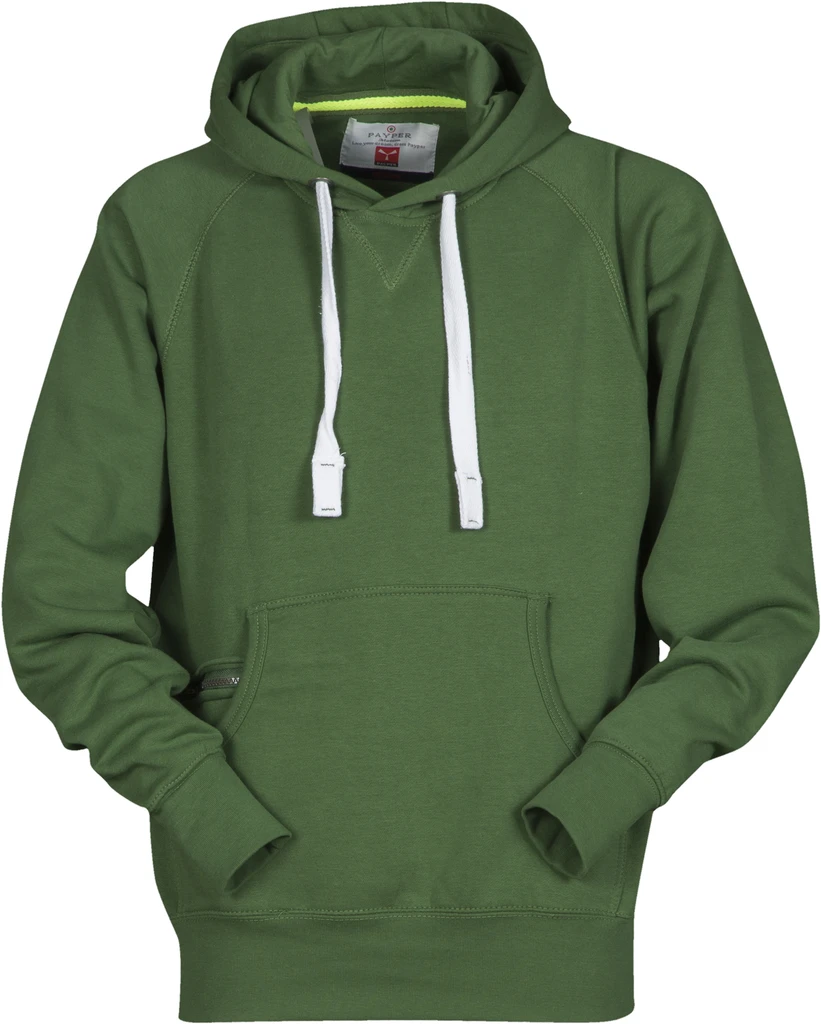 Dvojité švy, kapuce, kovová očka na kapuci, bílá stahovací šňůrka, raglánové rukávy, dekorativní prošití do "V" pod výstřihem, klokaní kapsa, malá kapsa na zip, elastické manžety a spodní lem, vyztužené švy