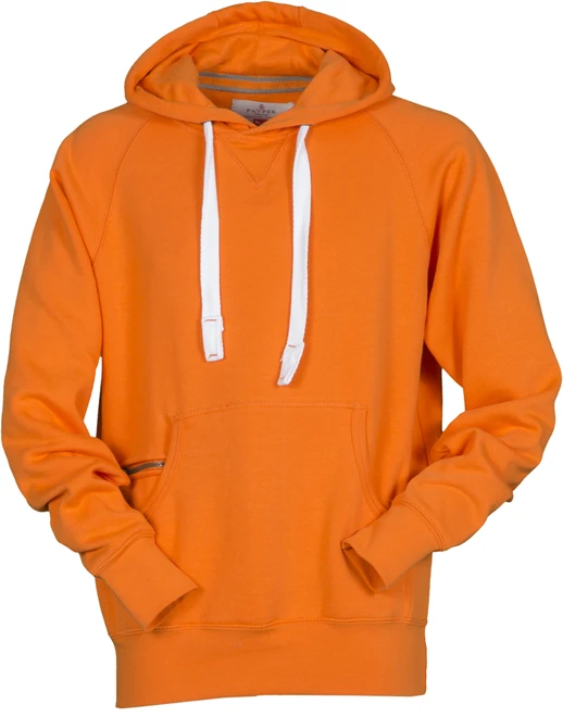 Dvojité švy, kapuce, kovová očka na kapuci, bílá stahovací šňůrka, raglánové rukávy, dekorativní prošití do "V" pod výstřihem, klokaní kapsa, malá kapsa na zip, elastické manžety a spodní lem, vyztužené švy