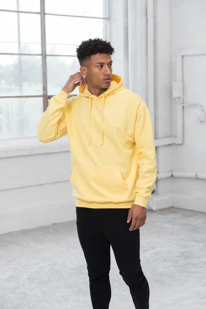 Dvojité prošití detailů, kapuce z dvojité vrstvy látky, šňůrky ve stejné barvě jako mikina, klokaní kapsa se skrytým vývodem na sluchátka, žebrované manžety a spodní lem, jednoduchá změna značky, ideální povrch pro potisk.