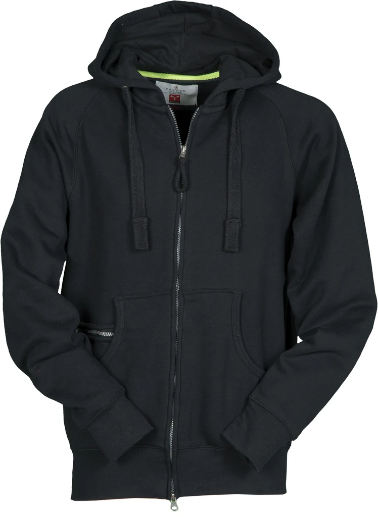 Plastový zip po celé délce, kovový dvojcestný jezdec, kapuce s dvojitým prošitím švů, bílá stahovací šňůrka, kovová očka na kapuci, raglánové rukávy, klokaní kapsa, malá kapsa na zip, elastické manžety a spodní lem, vyztužené švy