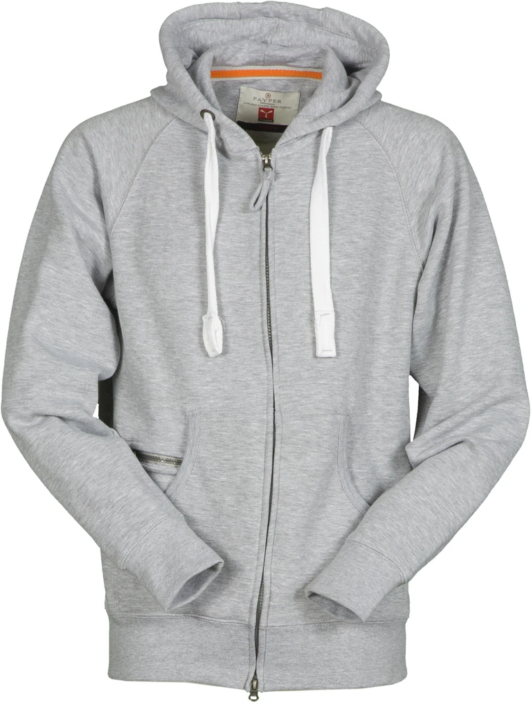 Plastový zip po celé délce, kovový dvojcestný jezdec, kapuce s dvojitým prošitím švů, bílá stahovací šňůrka, kovová očka na kapuci, raglánové rukávy, klokaní kapsa, malá kapsa na zip, elastické manžety a spodní lem, vyztužené švy