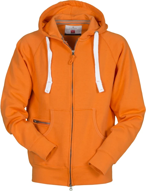 Plastový zip po celé délce, kovový dvojcestný jezdec, kapuce s dvojitým prošitím švů, bílá stahovací šňůrka, kovová očka na kapuci, raglánové rukávy, klokaní kapsa, malá kapsa na zip, elastické manžety a spodní lem, vyztužené švy