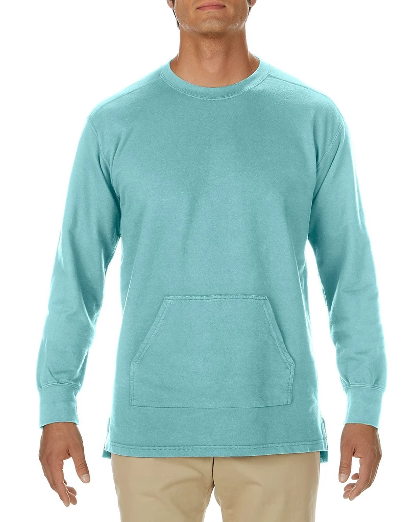 Předepraná a jednotlivě barvená tkanina (garment dye), páska za krkem (twill), 1x1 žebrované manžety rukávů, klokaní kapsa, snížený pas, postranní rozparky, dvojité prošití spodního lemu.