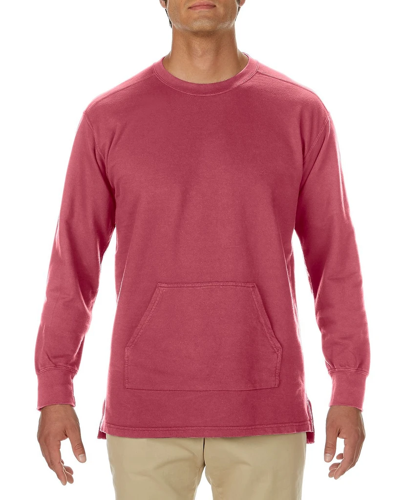 Předepraná a jednotlivě barvená tkanina (garment dye), páska za krkem (twill), 1x1 žebrované manžety rukávů, klokaní kapsa, snížený pas, postranní rozparky, dvojité prošití spodního lemu.