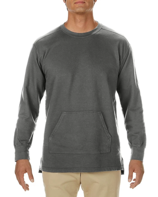 Předepraná a jednotlivě barvená tkanina (garment dye), páska za krkem (twill), 1x1 žebrované manžety rukávů, klokaní kapsa, snížený pas, postranní rozparky, dvojité prošití spodního lemu.