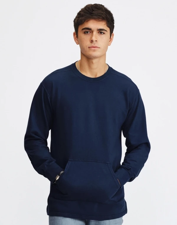 Předepraná a jednotlivě barvená tkanina (garment dye), páska za krkem (twill), 1x1 žebrované manžety rukávů, klokaní kapsa, snížený pas, postranní rozparky, dvojité prošití spodního lemu.