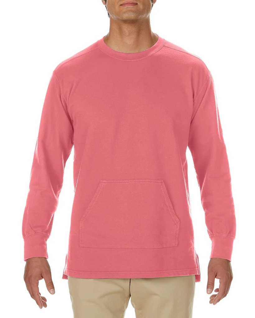 Předepraná a jednotlivě barvená tkanina (garment dye), páska za krkem (twill), 1x1 žebrované manžety rukávů, klokaní kapsa, snížený pas, postranní rozparky, dvojité prošití spodního lemu.