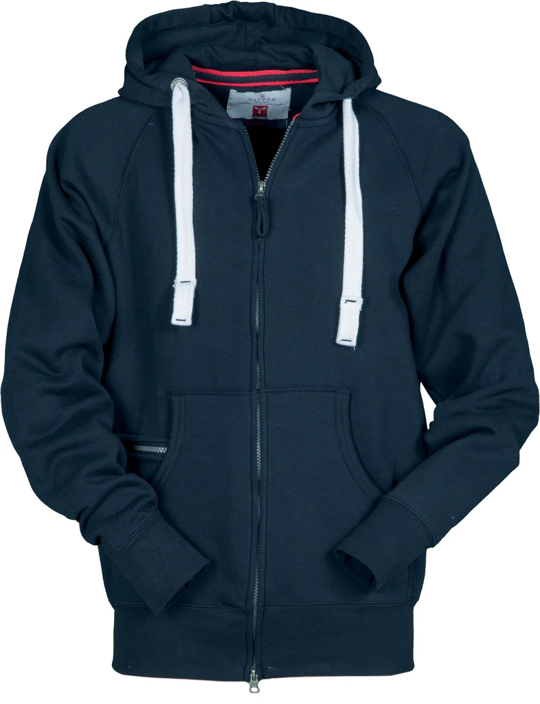 Zip po celé délce, kovový dvojcestný jezdec, kapuce s dvojitým prošitím švů, bílá stahovací šňůrka, kovová očka na kapuci, raglánové rukávy, klokaní kapsa, malá kapsa na zip, elastické manžety a spodní lem, vyztužené švy