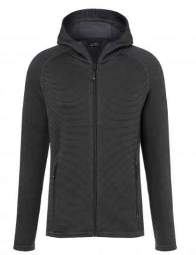 Příjemně měkká bi-elastická snadno udržovatelná tkanina, jemný pruhovaný vzhled, kapuce, raglánové rukávy, ploché švy, 2 boční kapsy na zip, YKK zipy.