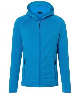 Příjemně měkká bi-elastická snadno udržovatelná tkanina, jemný pruhovaný vzhled, kapuce, raglánové rukávy, ploché švy, 2 boční kapsy na zip, YKK zipy.