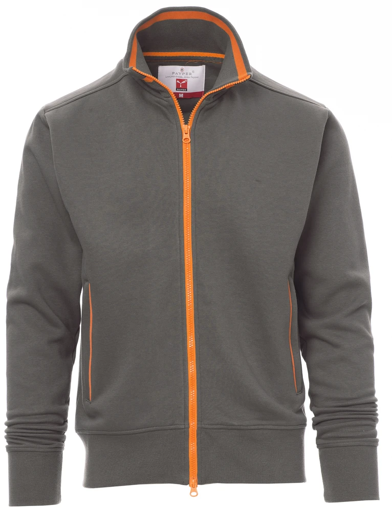 Plastový kontrastní zip po celé délce, dvojcestný kovový jezdec, kontrastní zip na žebrovaném límci a kapsách na zip, vsazené rukávy, vyztužené švy, elastické manžety a spodní lem