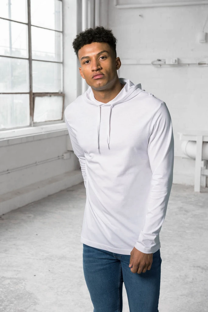 Dvojité prošití detailů, zeštíhlující střih, jemný lehký materiál, šňůrky ve stejné barvě jako mikina, jednoduchá změna značky.