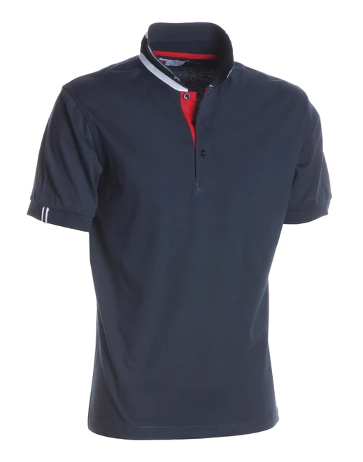 Krátký rukáv, zapínání na 3 knoflíčky (tón v tónu), na límci kontrastní pruh, vnitřní knoflíková léga a boční rozparky v kontrastní barvě, na pravém rukávu svislý úzký proužek v kontrastní barvě, žebrované manžety, výztužná páska za krkem