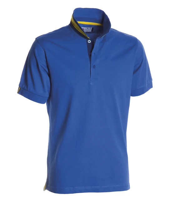 Krátký rukáv, zapínání na 3 knoflíčky (tón v tónu), na límci kontrastní pruh, vnitřní knoflíková léga a boční rozparky v kontrastní barvě, na pravém rukávu svislý úzký proužek v kontrastní barvě, žebrované manžety, výztužná páska za krkem
