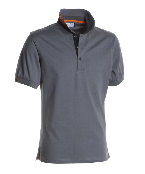 Krátký rukáv, zapínání na 3 knoflíčky (tón v tónu), na límci kontrastní pruh, vnitřní knoflíková léga a boční rozparky v kontrastní barvě, na pravém rukávu svislý úzký proužek v kontrastní barvě, žebrované manžety, výztužná páska za krkem