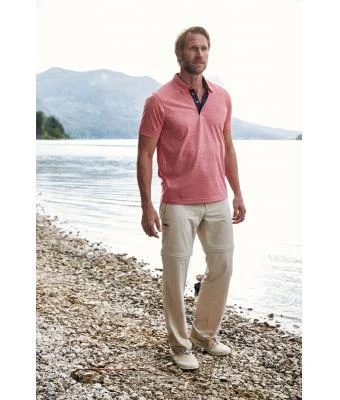 Funkční materiál vhodný pro volný čas a sport, prodyšný rychleschnoucí a vlhkost regulující materiál, příjemný jednoduchý úplet s jemným proužkem, zapínání na 4 knoflíčky, vnitřní léga a páska na límečku v kontrastní barvě.