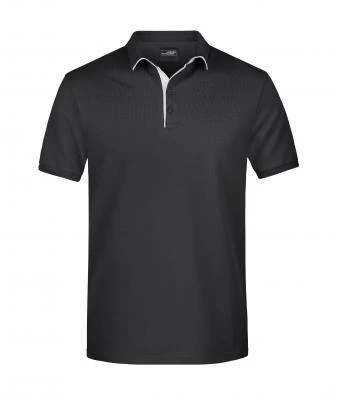 Kvalitní piké, pletený límec a manžety rukávů, kontrastní pruhy na límci, léga v kontrastní barvě, knoflíčky tón v tónu, boční rozparky, zapínání na 3 knoflíčky.