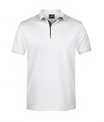 Kvalitní piké, pletený límec a manžety rukávů, kontrastní pruhy na límci, léga v kontrastní barvě, knoflíčky tón v tónu, boční rozparky, zapínání na 3 knoflíčky.