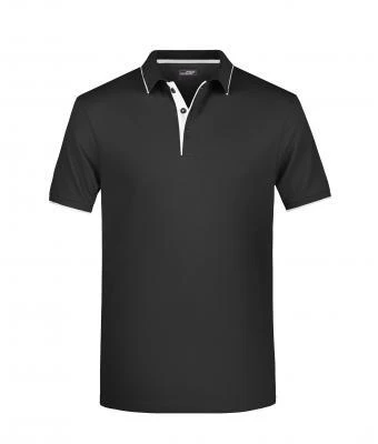 Kvalitní piké, pletený límec a manžety rukávů, kontrastní pruhy na límci a manžetách, léga v kontrastní barvě, knoflíčky tón v tónu, boční rozparky, zapínání na 3 knoflíčky.