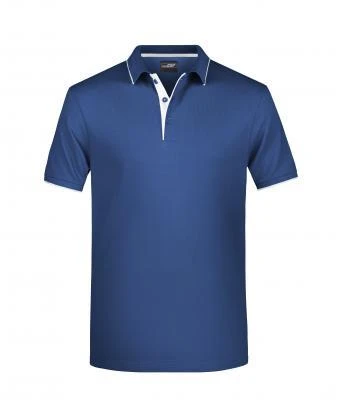 Kvalitní piké, pletený límec a manžety rukávů, kontrastní pruhy na límci a manžetách, léga v kontrastní barvě, knoflíčky tón v tónu, boční rozparky, zapínání na 3 knoflíčky.