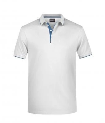 Kvalitní piké, pletený límec a manžety rukávů, kontrastní pruhy na límci a manžetách, léga v kontrastní barvě, knoflíčky tón v tónu, boční rozparky, zapínání na 3 knoflíčky.