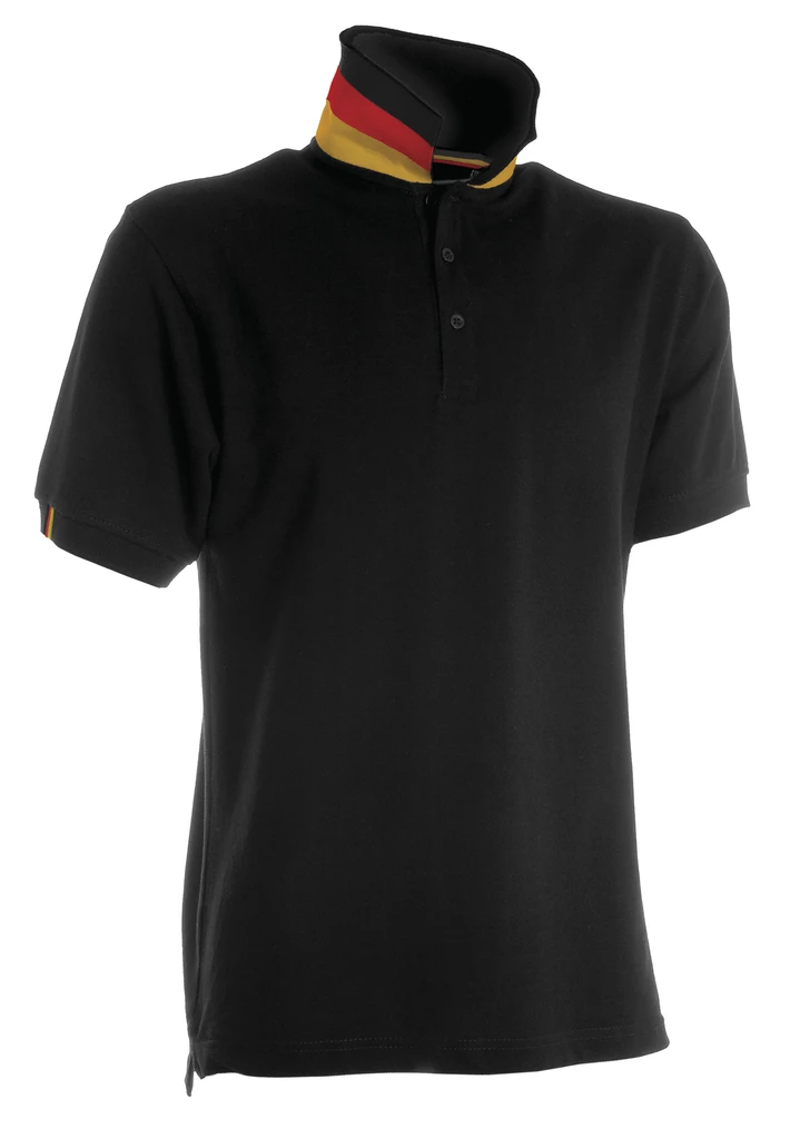 Krátký rukáv, léga s 3 ladícími knoflíky, na rubové straně límce motiv vlajky, na pravém rukávu proužky ve stejné barvě jako vlajka, žebrování na límci a manžetách, výztužná páska za krkem v barvě vlajky, vyztužené boční švy