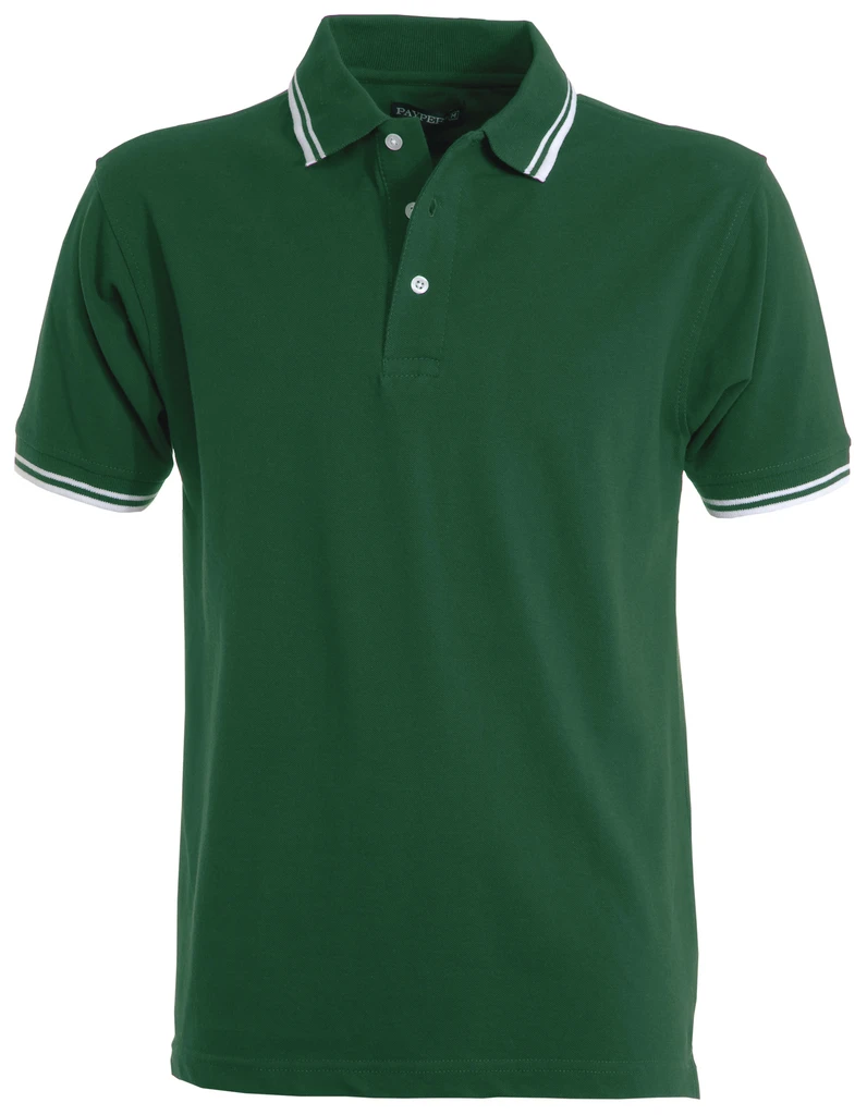 Krátký rukáv, zapínání na 3 bílé knoflíky, žebrování na límci a manžetách, kontrastní proužek na límci a manžetách, boční rozparky s vyztuženými švy, elastické švy, výztužná páska za krkem
