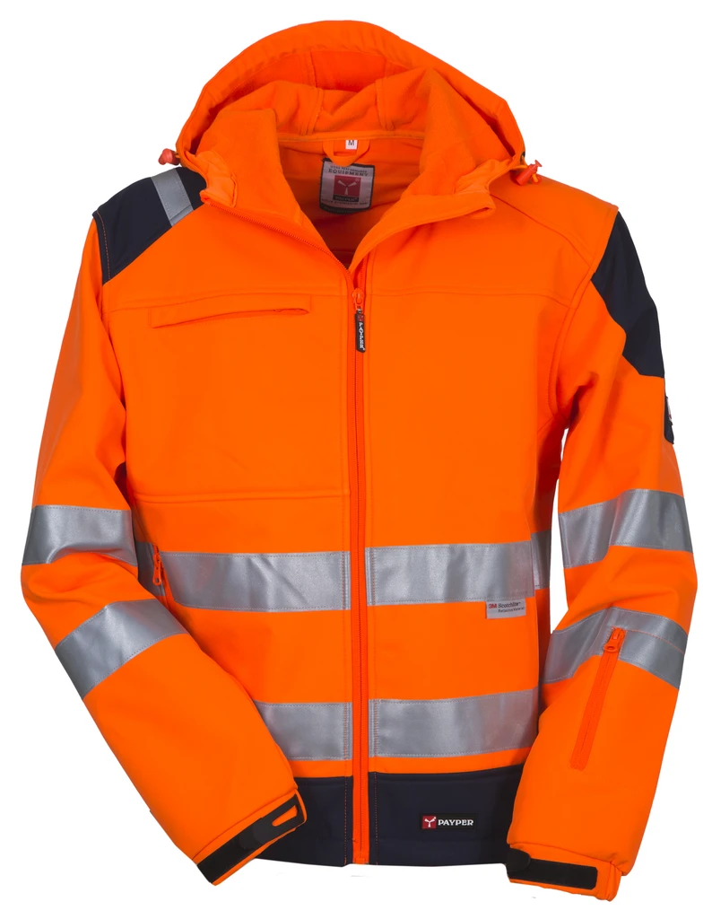 Vysoká viditelnost, 3M reflexní pruhy, raglánové rukávy, tvarovaná kapuce s dvojitým prošitím a stahovací šňůrkou, zip po celé délce, nastavitelné manžety pomocí suchého zipu, 2 boční kapsy na zip, náprsní kapsa, kapsa na levém rameni