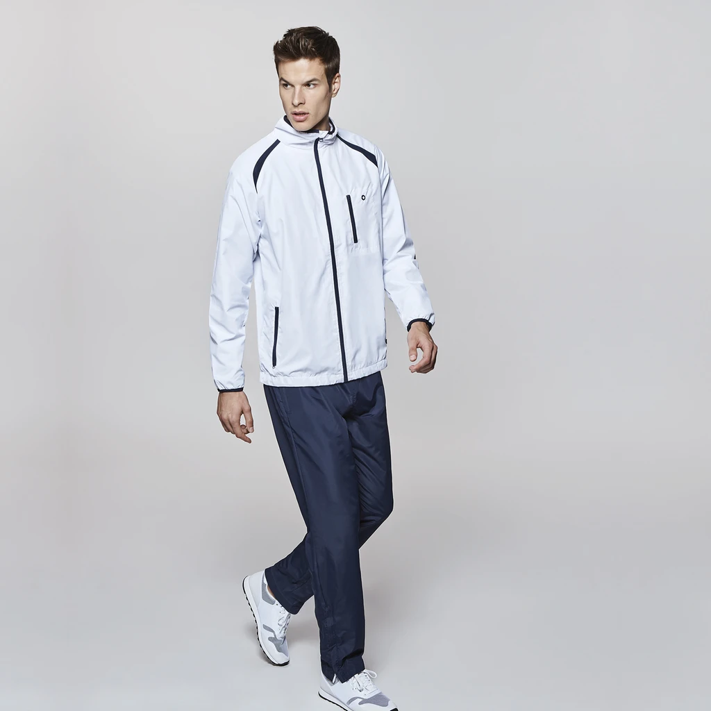 Bunda se zipem, kapuce v límci, náprsní kapsa s kovovým očkem pro kabel na mobilní telefon, kapsa na zip v kontrastní barvě, spodní okraj se stahovací šňůrkou se zarážkami, podšívka ze síťoviny, kalhoty s elastickým pasem a stahovací šňůrkou ve stejné barvě, zip na spodní části nohavice, vhodné pro potisk sublimací.