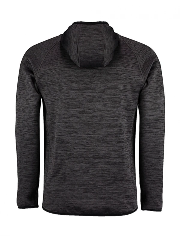 Tkaný fleecový vnitřek, ploché švy, páska za krkem, kontrastní panely pod ramenem k pasu, zpětný zip, raglánové rukávy, postranní kapsy na zip, lemování na kapuci, manžetách a spodním lemu, delší zadní část.