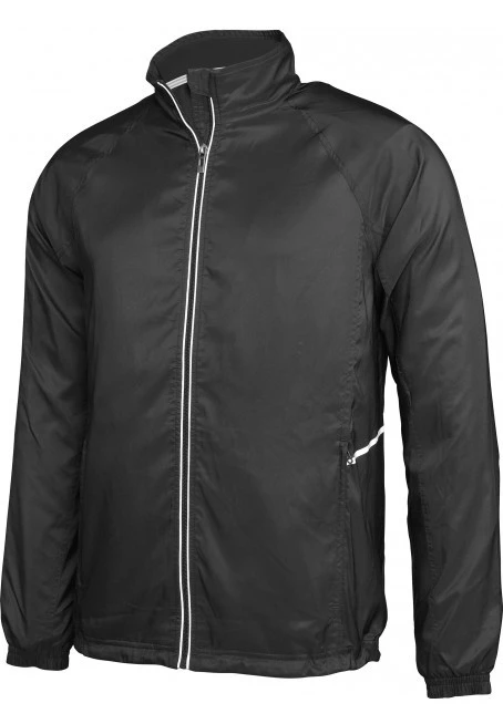 Rychleschnoucí materiál. Podšívka ze síťoviny. Zip po celé délce, s reflexním lemováním. 2 přední kapsy na zip. 1 vnitřní kapsa. Elastické manžety. Kolem spodního lemu stahovací šňůrka se zarážkami. Reflexní proužky na bocích.