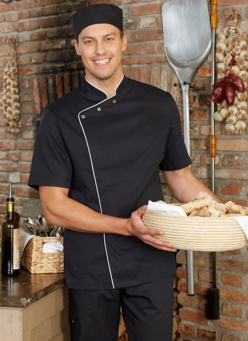 Malý stojáček, kontrastní lemování kolem celé délky, diagonální klopa s 3 cvočky, 2 kapsy v bočních švech, boční rozparky, jednoduchá údržba, lze prát na 95°C.