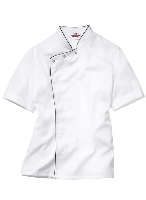 Malý stojáček, kontrastní lemování kolem celé délky, diagonální klopa s 3 cvočky, 2 kapsy v bočních švech, boční rozparky, jednoduchá údržba, lze prát na 95°C.