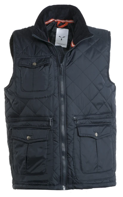 Prošívaná vesta, 8 mm široký plastový zip po celé délce, kovový jezdec, boční průduchy na knoflík, 5 vnějších kapes - 2 se speciálním zavíracím systémem, vnitřní kapsa, vatová vycpávka, podšívka na límci z žebrovaného manšestru