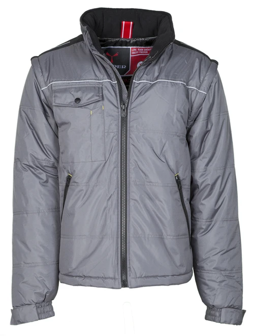 Plastový zip po celé délce, 2 vnější prostorné kapsy na zip, prostorná kapsa na hrudi na mobilní telefon, vnitřní kapsa, reflexní lemování na ramenou a hrudi, vatová vycpávka, podšívka na límci z microfleecu