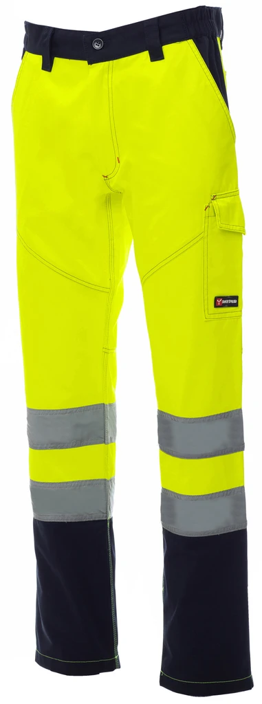 Vysoká viditelnost, vhodné pro všechna roční období, reflexní pruhy, elastické boky, poutka na pásek, zapínání na zip a knoflík, 2 přední kapsy, boční kapsa, kapsa na metr, 2 zadní kapsy (1 otevřená, 1 s klopou na suchý zip), kontrastní prošití, trojité švy v rozkroku a na vnitřní nohavici