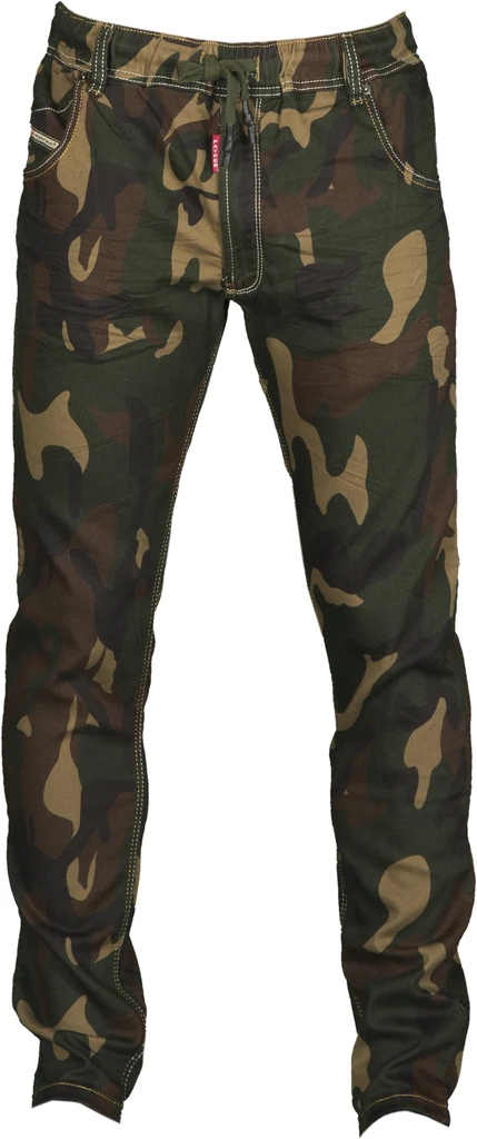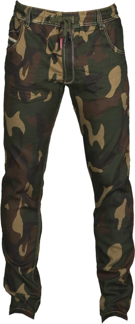 5 kapes, elastický pas se stahovací šňůrkou, poutka na pásek, zapínání na kovový zip, nošený vybledlý vzhled, kontrastní švy, dvojité švy na vnitřní straně nohavic, zúžené nohavice