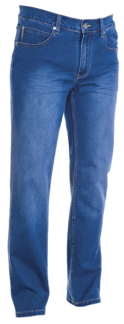 5 kapes, zapínání na kovový zip a knoflík, poutka na pásek v pase, nošený vybledlý vzhled, kontrastní švy, dvojité švy na vnitřní straně nohavic, rovný střih