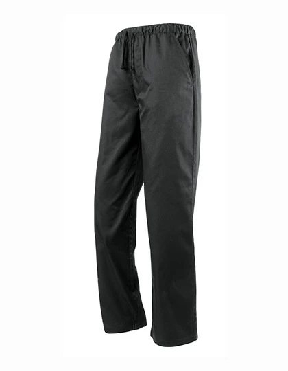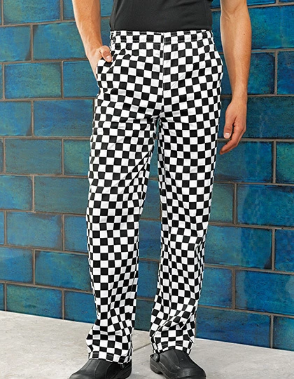 Potištěný twill - károvaný vzor, barvená twillová příze - černé, unisex kalhoty pro kuchaře, elastický pas pro snadné oblékání, ve vnitřní délce 30.5''/77 cm, boční kapsy v džínsovém stylu, tunýlek, vyrobeno z materiálu se standardem Öko-Tex ® 100, WRAP certifikace.