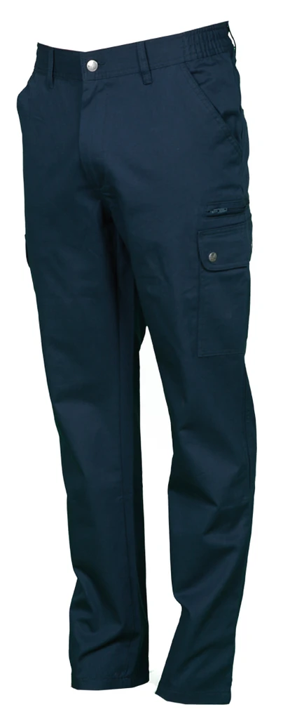 Vhodné na všechny roční období, elastické řasení na bocích, poutka na pásek, zapínání na zip a knoflík, 2 přední kapsy, 2 boční kapsy s klopou, na levé nohavici kapsa na zip, 2 zadní kapsy na knoflík