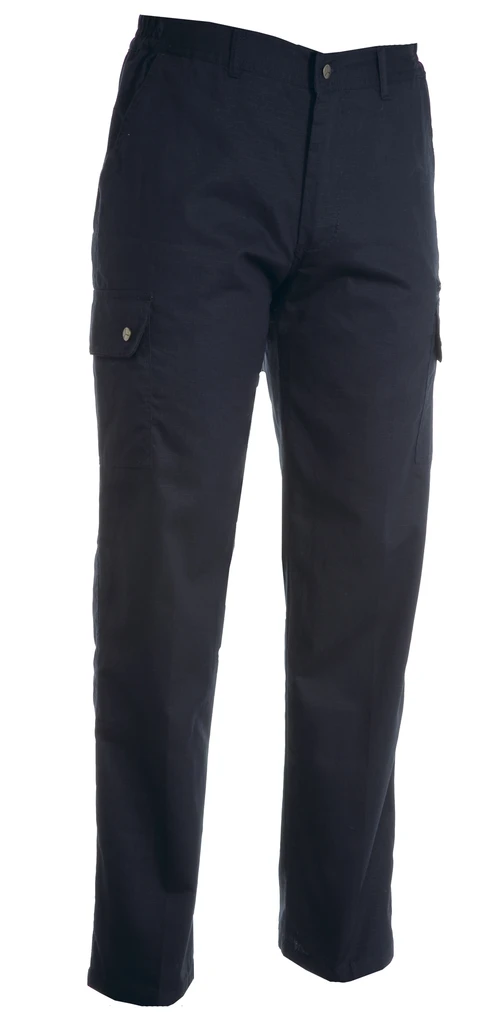 Letní kalhoty, elastické řasení na bocích, poutka na pásek, zapínání na zip a knoflík, 2 přední kapsy, 2 boční kapsy s klopou, na levé nohavici kapsa na zip, 2 zadní kapsy na knoflík
