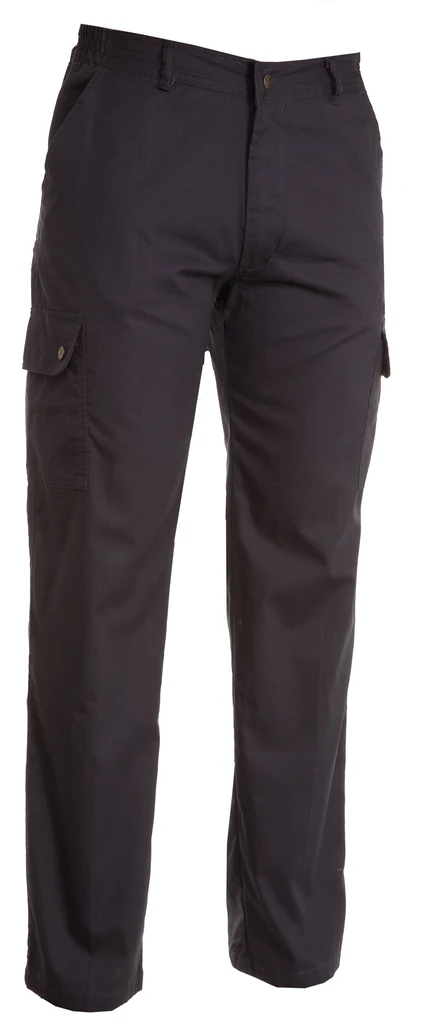 Letní kalhoty, elastické řasení na bocích, poutka na pásek, zapínání na zip a knoflík, 2 přední kapsy, 2 boční kapsy s klopou, na levé nohavici kapsa na zip, 2 zadní kapsy na knoflík