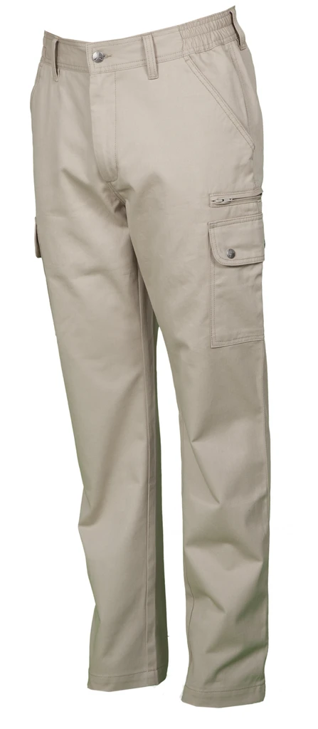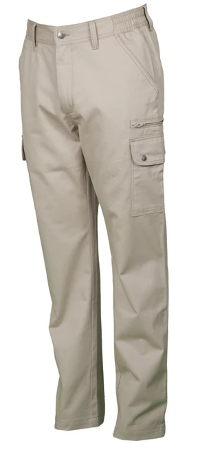 Vhodné na všechny roční období, elastické řasení na bocích, poutka na pásek, zapínání na zip a knoflík, 2 přední kapsy, 2 boční kapsy s klopou, na levé nohavici kapsa na zip, 2 zadní kapsy na knoflík