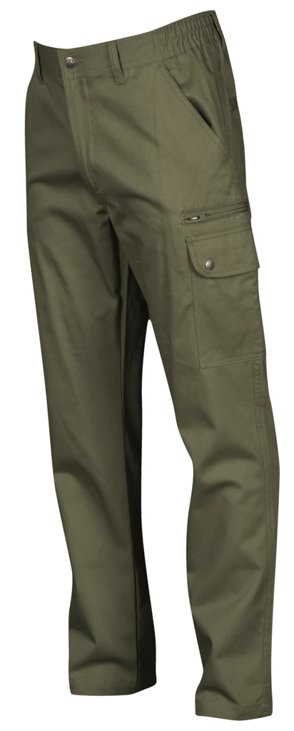 Vhodné na všechny roční období, elastické řasení na bocích, poutka na pásek, zapínání na zip a knoflík, 2 přední kapsy, 2 boční kapsy s klopou, na levé nohavici kapsa na zip, 2 zadní kapsy na knoflík