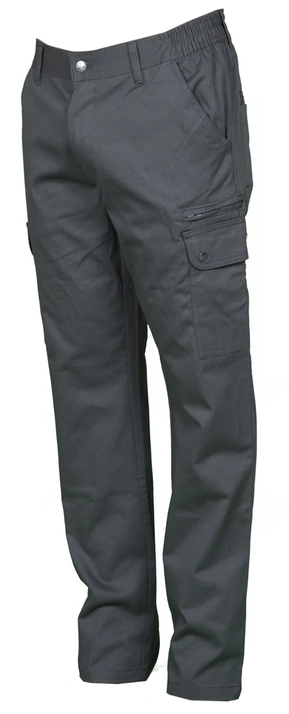 Vhodné na všechny roční období, elastické řasení na bocích, poutka na pásek, zapínání na zip a knoflík, 2 přední kapsy, 2 boční kapsy s klopou, na levé nohavici kapsa na zip, 2 zadní kapsy na knoflík