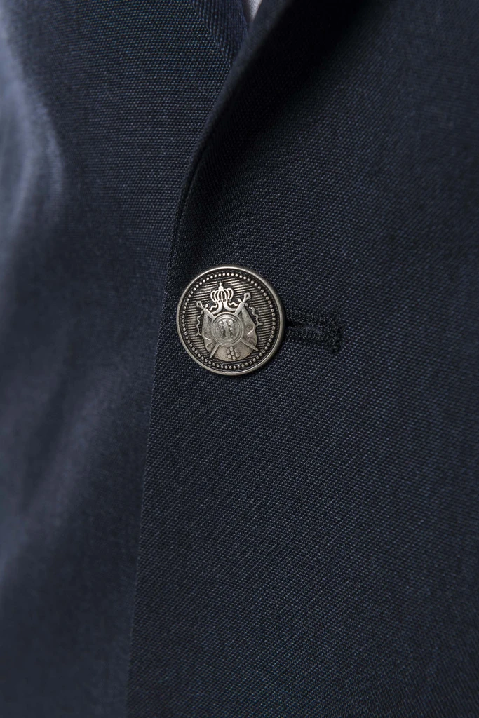 Zapínání na 2 kovové knoflíky s heraldickými motivy.